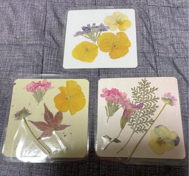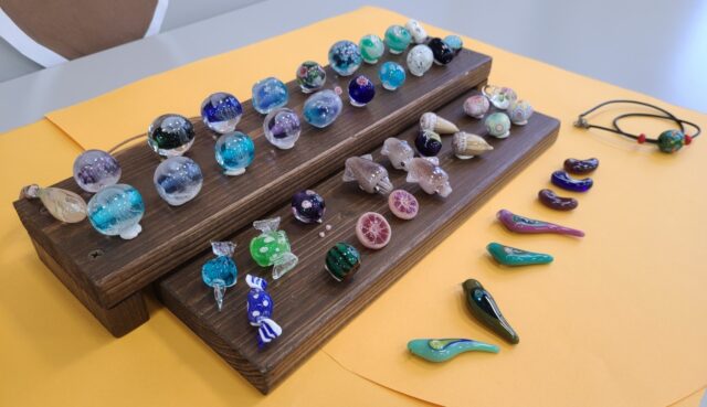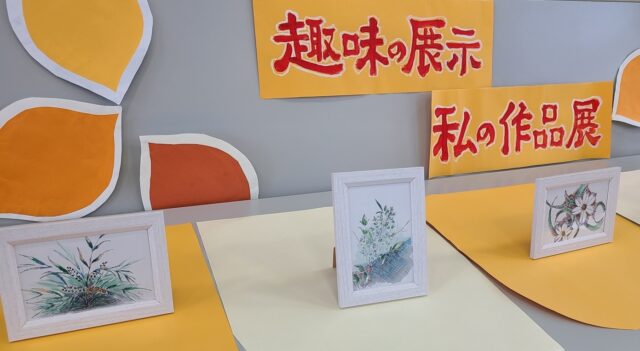 避難者有志の方々が作成した絵葉書やとんぼ玉の作品を披露した趣味の展示コーナー、名刺作成コーナーが設けられ、皆さんそれぞれに参加されていました。