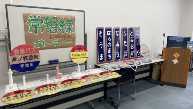浜通りを走るJR常磐線各駅の昔の駅名プレート、併せて走行中の常磐線のビデオが流されており、灯台のミニチアのペーパークラフトが展示されていました。