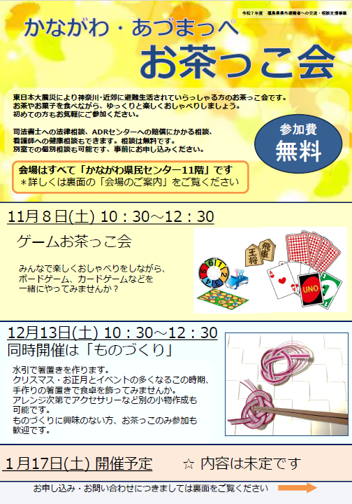 11月の「かながわ・あづまっぺお茶っこ会」は8日の土曜日に開催いたします。