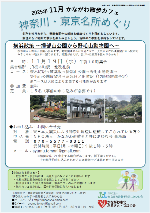 【お知らせ】11/19(水)神奈川散歩カフェ・横浜散策~掃部山公園から野毛山動物園へ~