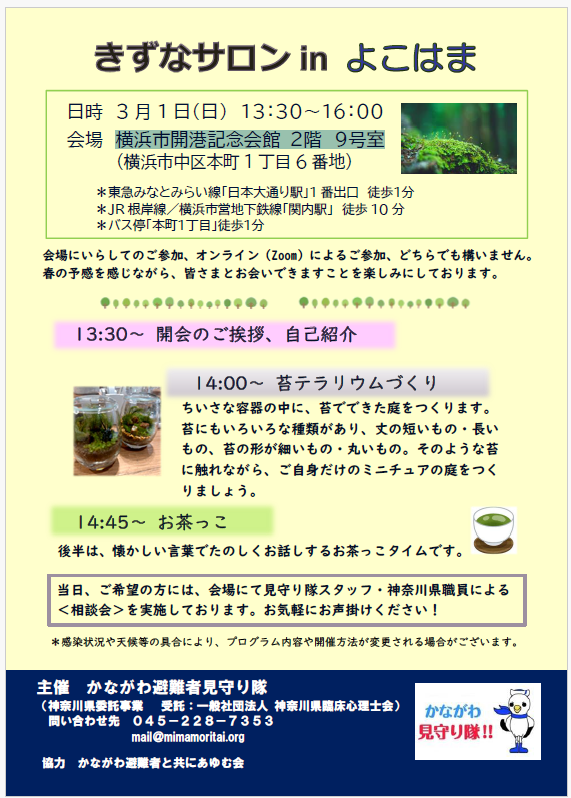 かながわ避難者見守り隊主催の、避難されている方向けのイベント「きずなサロンin横浜」が開催されます。