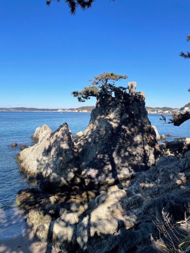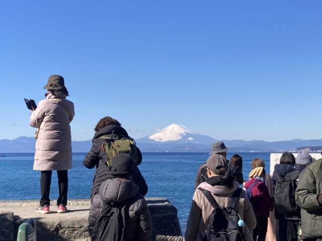 バスに乗って森戸神社へ移動、本殿参拝後裏手に回ると石原裕次郎さんの記念碑の背景には絶景の富士山が見えて、みなさん「最高っ!」とテンション上がり気味。