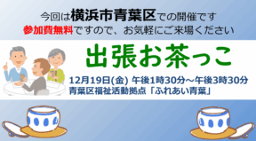 東日本大震災および原発事故により神奈川県・近郊に避難されている方々に参加していただく茶話会です。今回の出張お茶っこ会は、12月19日(金)横浜市青葉区福祉活動拠点「ふれあい青葉」での開催となります。